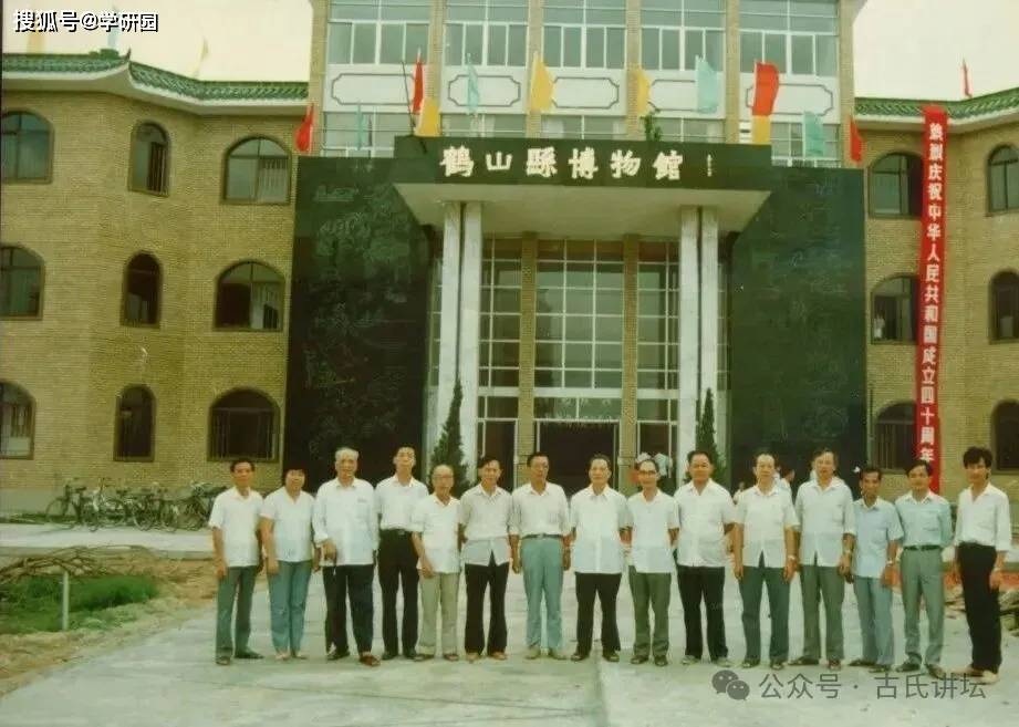 1989年10月1日鹤山县博物馆落成,出席落成的领导嘉宾从左至右为:麦浪秋、黄杏笑、谢坚持、易坤成、欧阳子方、古禹明、胡其盛、刘长金、苏广献、李国贝、林潮伟、区洪镜、黄坚、梁国强、张振升。
